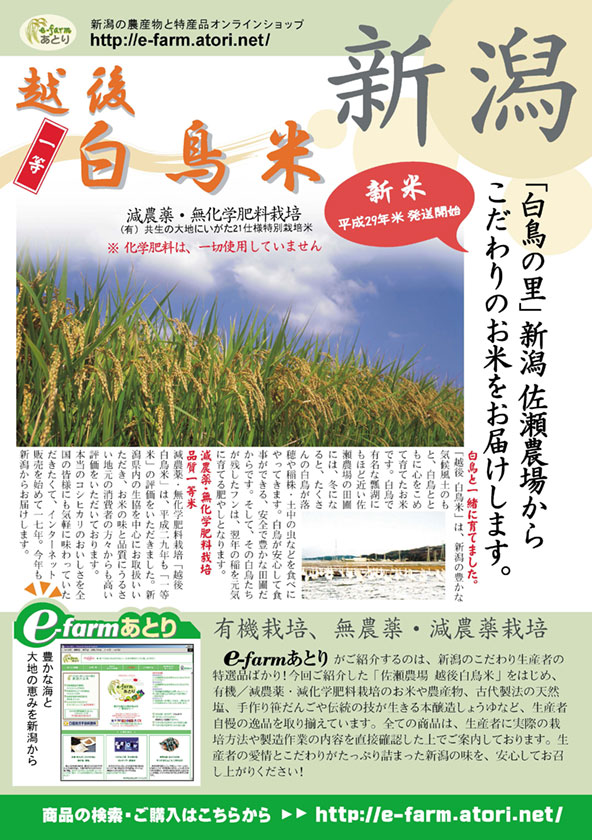 越後白鳥米は、新潟平野の北西部・新発田市加治川地区(旧 北蒲原郡加治川村)で、有機・減農薬栽培による米作りのリーダーとして活躍する佐瀬鉄栄さんの作ったお米です。