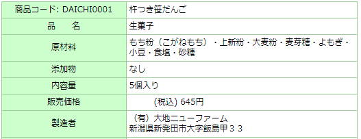 地元で評判の(有)大地ニューファーム(新潟県新発田市飯島甲33)の杵つき「笹だんご」は、天然乾燥よもぎをたっぷり使い、もち米を8割以上使用した杵つきのお団子と、あずきの風味が生きた上品な「あん」が特徴。1つ1つ丹念に笹で包んだ手作りの味です。