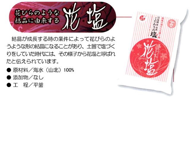 平釜で海水を濃縮して結晶を成長させていく過程で条件が整うと、花びらのような形の薄く大きな塩の結晶となります。その結晶の形から「花塩」と呼ばれている伝統の塩です。